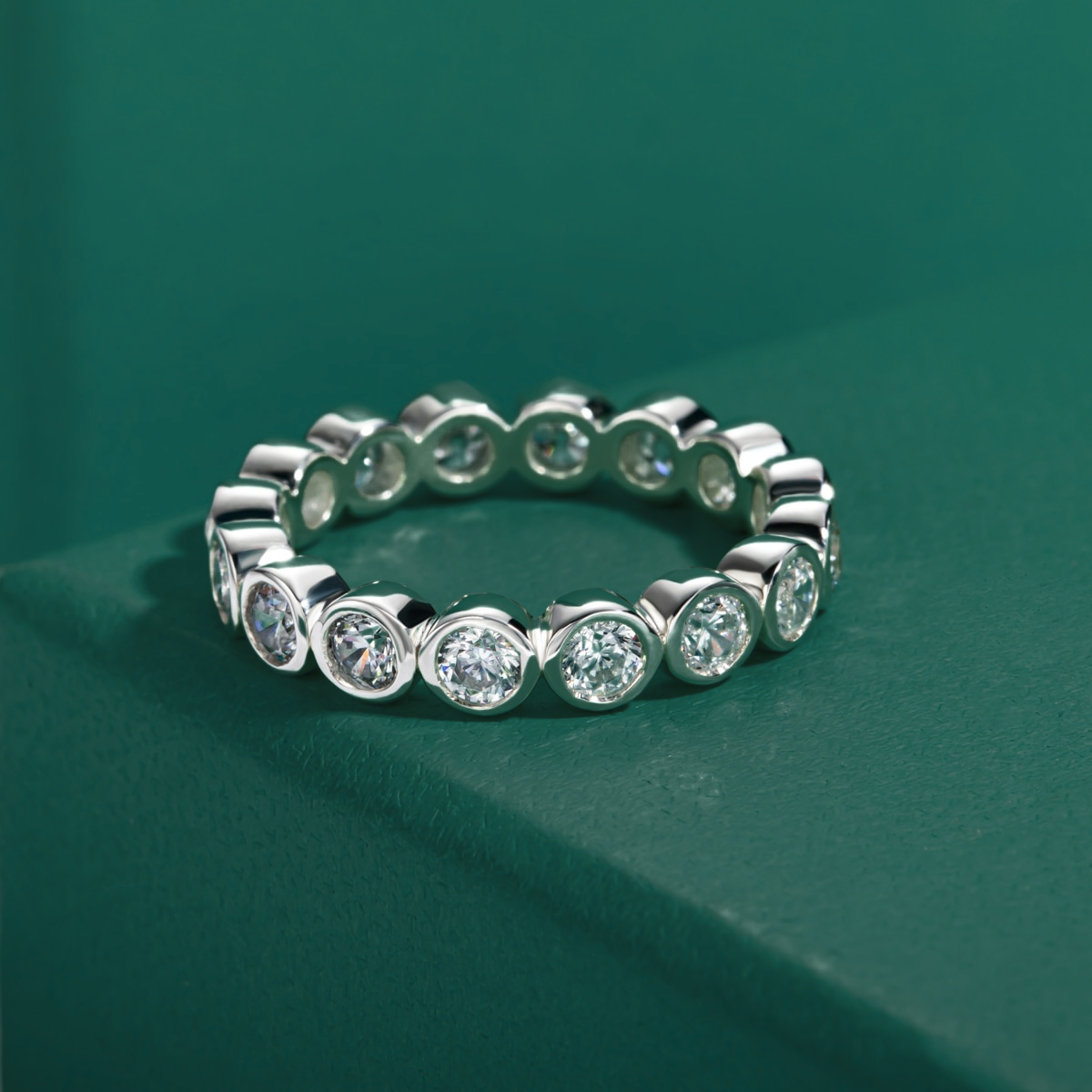 - Moissanites Brilhantes (3mm / 0,1ct cada): Lapidação brilhante em cravação inglesa, que valoriza o brilho natural das pedras.