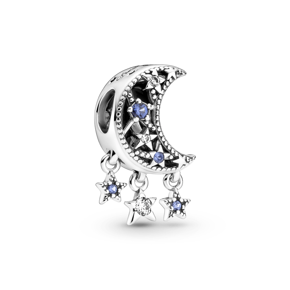 Esse charm exclusivo possui acabamento artesanal e combina uma lua crescente cravejada de zircônias cúbicas brilhantes, estrelas recortadas e microesferas polidas que adicionam textura e luminosidade. Três estrelas assimétricas pendem suavemente da base da lua, criando um movimento poético e sofisticado.