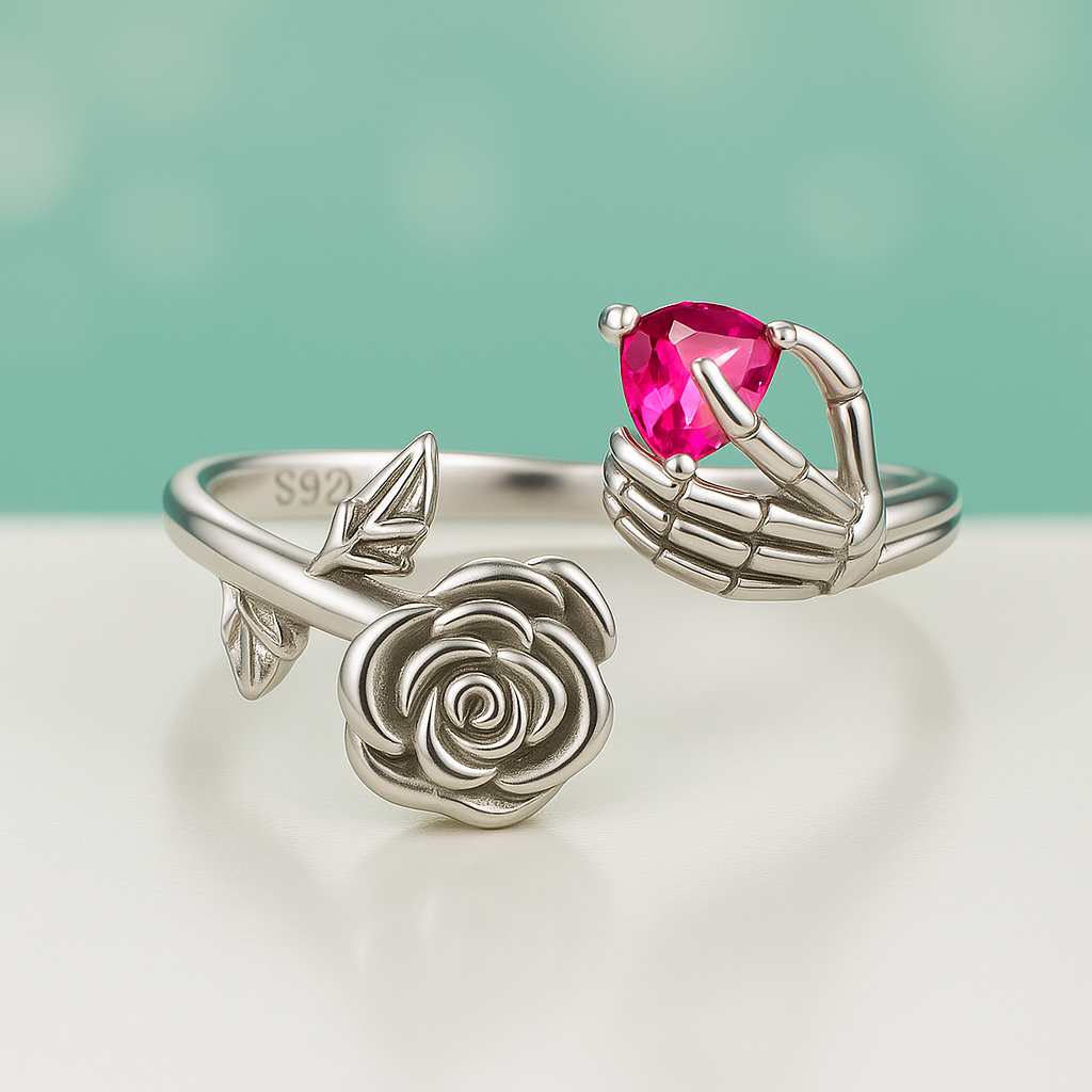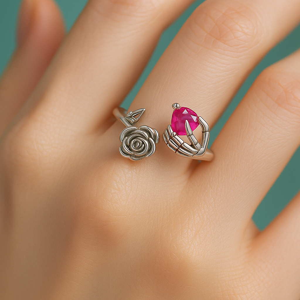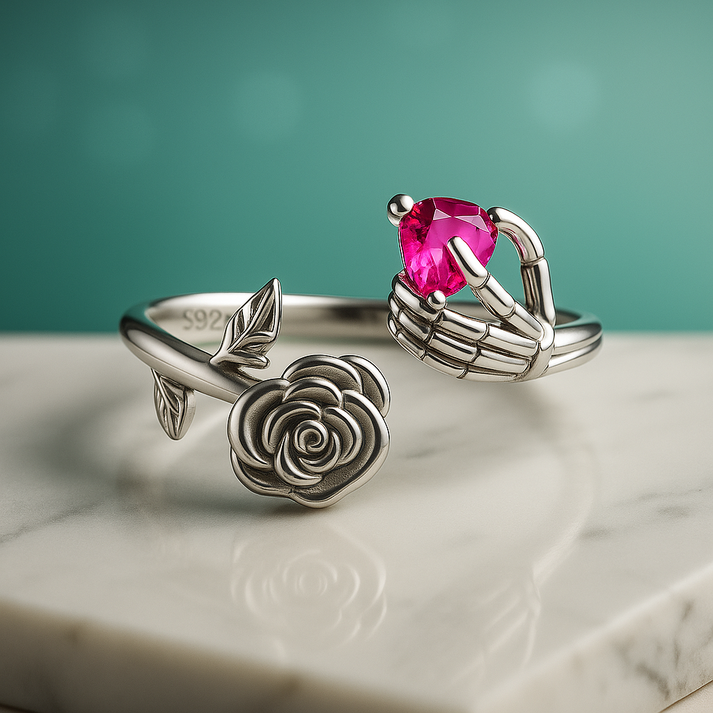 Anel Rosa Caveira Regulável em Prata 950 com Cristal em Coração - Yuna Joias
