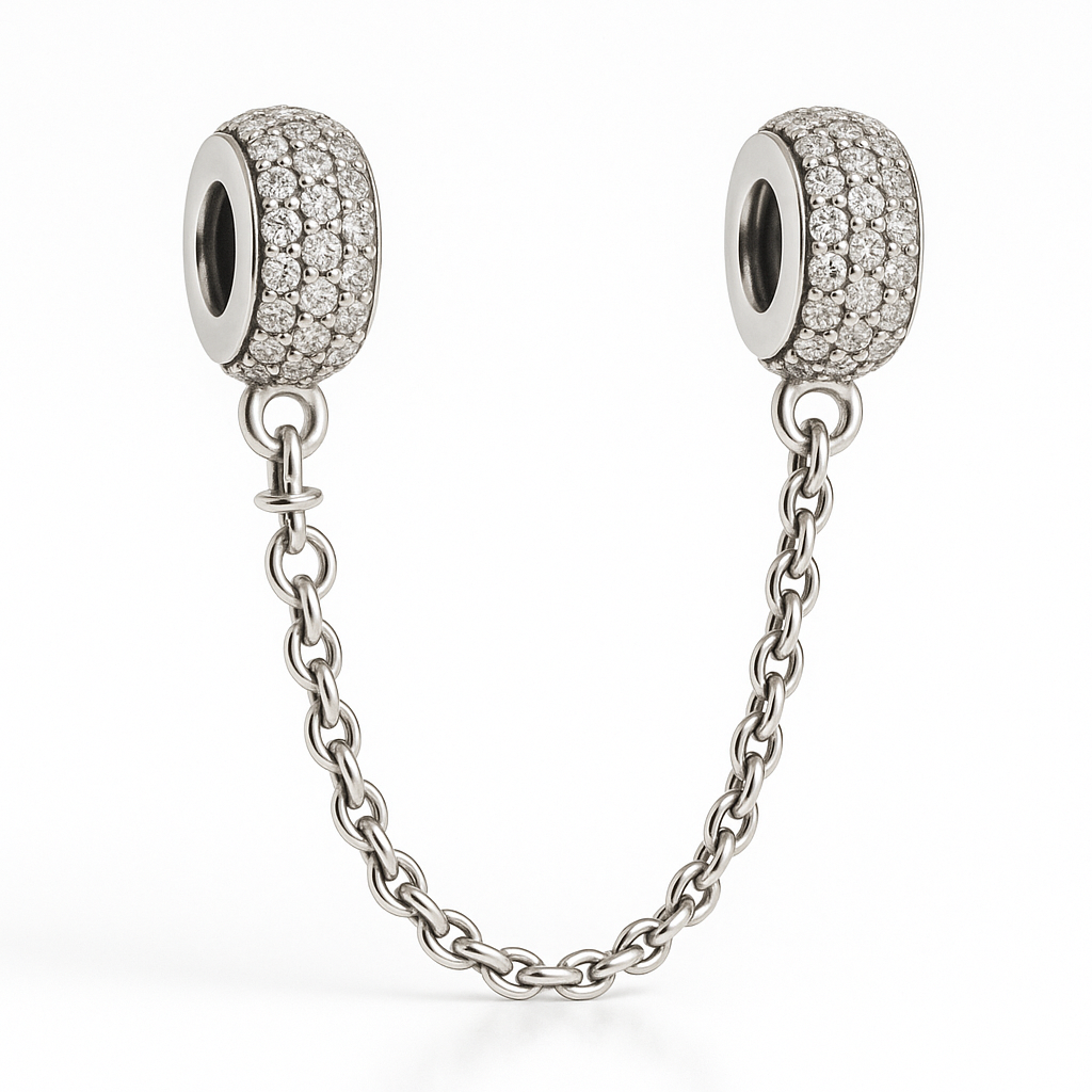 O Berloque Corrente de Segurança Cravejado em Prata 925 é o acessório ideal para proteger sua pulseira com muito estilo. Feito em prata de lei 925, material nobre reconhecido por sua resistência e brilho duradouro, este berloque garante que suas joias fiquem sempre seguras no pulso, mesmo durante o uso diário.